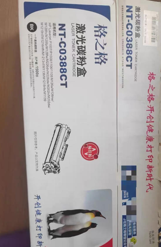 全新格之格NT-C0388CT激光碳粉盒,黑色,原装未拆封,包装都在(外包装盒拆了,里面硒鼓没有拆封)。易加粉设计,页量1500页,适合HP P1007/P1008/P1106/P1108/M126a/M126nw/M128fn/M128fp/M128fw/M226dn/M226dw/M202n/M202dw/M1219nf/M1216nf/M1213nf/M1136/M1218nfs/M1139等型号打印机。家里换打印机闲置出来的,没用过。